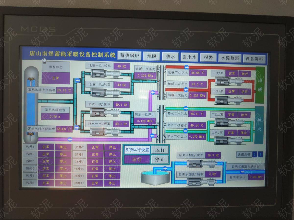1. 項目位于唐山市曹妃甸區(qū),北堡村附近。加壓泵使用變頻器根據管道反饋水壓自動調速運行頻率,維持自來水水壓恒定。熱水通過板式換熱器獲得蓄熱水箱的熱能,維持熱水恒溫。 2. 水箱蓄熱功能自動運行,反饋電流異常時能自動顯示故障信息(當地電價沒有峰谷) 3. 制熱時二次網水泵不間斷運行,一次網水泵通過間歇運行給板式換熱器維持恒定溫度,從蓄熱水箱獲取熱源。沒有制冷功能。 4. 所有傳感器和設備運行數據接入軟泥物聯網系統(tǒng),機房自動運行無人值守,通過手機軟件可隨時查看設備運行情況和修改設定參數。 |