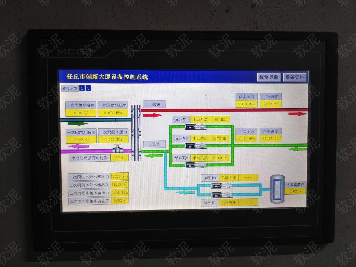 1. 項(xiàng)目位于任丘市創(chuàng)新大廈地下機(jī)房,創(chuàng)新大廈A座和B座同時(shí)使用的中央空調(diào)設(shè)備,只用于夏季制冷模式。夜間谷電價(jià)期間給大水箱降溫至3攝氏度左右,白天二次網(wǎng)循環(huán)泵不間斷運(yùn)行,一次網(wǎng)循環(huán)泵間歇運(yùn)行通過(guò)板式換熱器來(lái)維持二次網(wǎng)恒溫。 2. 天氣最炎熱期間,水箱能儲(chǔ)存的冷量不足,中央空調(diào)直接對(duì)二次網(wǎng)降溫。 3. 中央空調(diào)的控制面板接入軟泥PLC編程,模擬人按按鈕的電信號(hào),實(shí)現(xiàn)手機(jī)遠(yuǎn)程即可啟停中央空調(diào)機(jī)組,無(wú)需到現(xiàn)場(chǎng)操作,同時(shí)根據(jù)電流表的反饋電流和供水水溫度反饋,能證明中央空調(diào)正常運(yùn)行。實(shí)現(xiàn)中央空調(diào)定時(shí)自動(dòng)啟停,同時(shí)又能通過(guò)軟泥物聯(lián)網(wǎng)平臺(tái)手動(dòng)啟停。 |