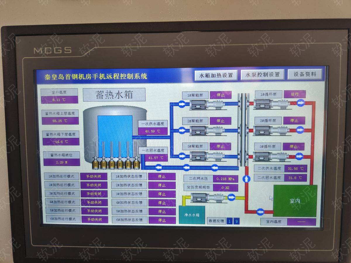 1. 冬季供暖系統(tǒng),夜間谷電價(jià)期間給大水箱蓄熱,二次網(wǎng)循環(huán)泵始終運(yùn)行,一次網(wǎng)循環(huán)泵通過(guò)間歇運(yùn)行,給板式換熱器升溫,維持二次網(wǎng)恒定溫度。白天不蓄熱,只釋放存儲(chǔ)的熱能,節(jié)約電費(fèi)。 2. 現(xiàn)場(chǎng)沒(méi)有人值班,通過(guò)手機(jī)軟件隨時(shí)可查傳感器數(shù)據(jù)。不限管理人員人數(shù),每人實(shí)名賬戶(hù),自動(dòng)保存操作記錄。 3. 設(shè)備可選擇自動(dòng)模式,根據(jù)設(shè)定參數(shù)自動(dòng)啟停。也可選擇手動(dòng)模式,直接啟停每個(gè)設(shè)備用于調(diào)試檢修。 4. 在軟泥物聯(lián)網(wǎng)平臺(tái)選擇每周的工作日和休息日(每周只需設(shè)置一次),工作日會(huì)正常蓄熱,休息日維持低溫運(yùn)行防凍節(jié)能。 |